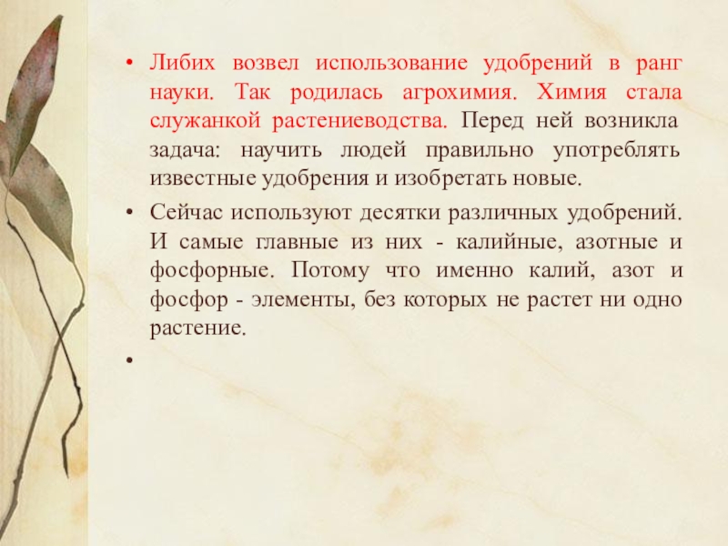 Слайд 6Либих возвел использование удобрений в ранг науки. Так родилась агрохимия. Химия