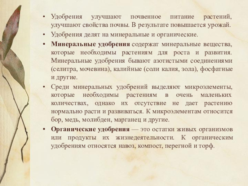 Слайд 7Удобрения улучшают почвенное питание растений, улучшают свойства почвы. В результате повышается