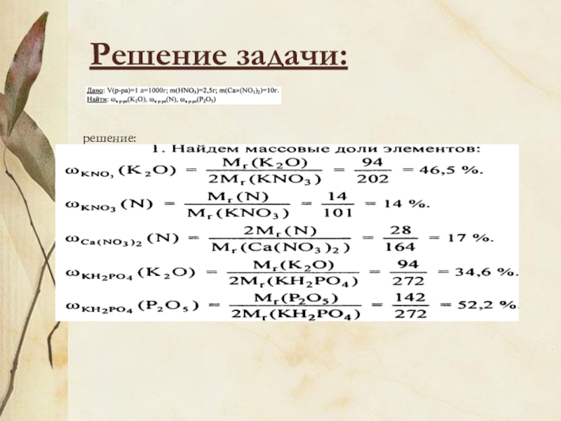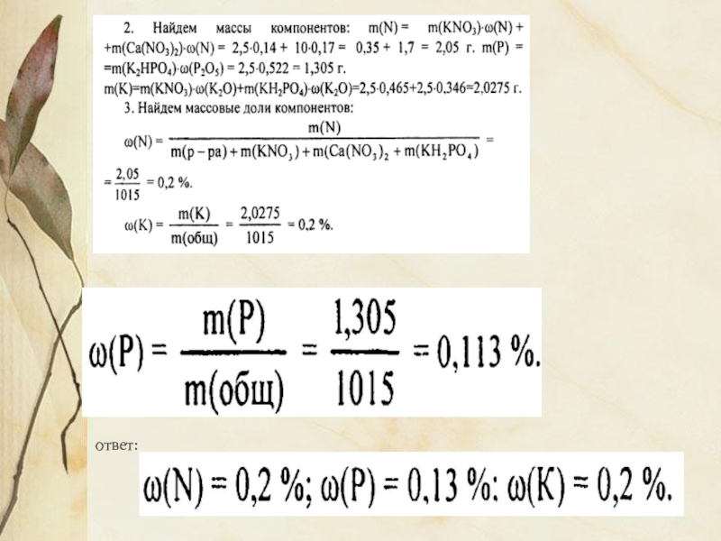 л воды растворяют 2,5 г KNO3, 2,5 г КН2PO4 и 10 г Ca(NO3)2. Какова массовая доля (в %) каждого из компонентов в такой подкормке?