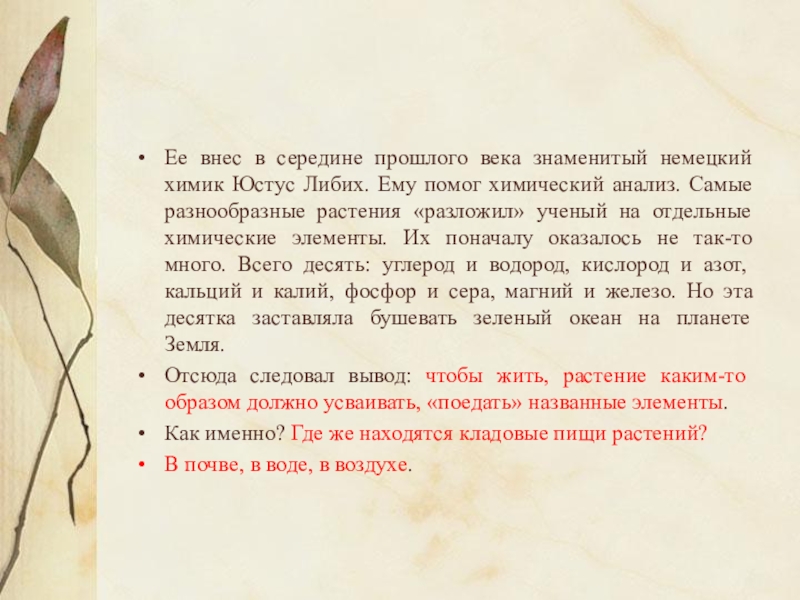 Отсюда следовал вывод: чтобы жить, растение каким-то образом должно усваивать, «поедать» названные элементы.