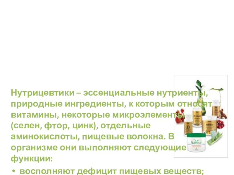 Слайд 10Нутрицевтики – эссенциальные нутриенты, природные ингредиенты, к которым относят витамины, некоторые