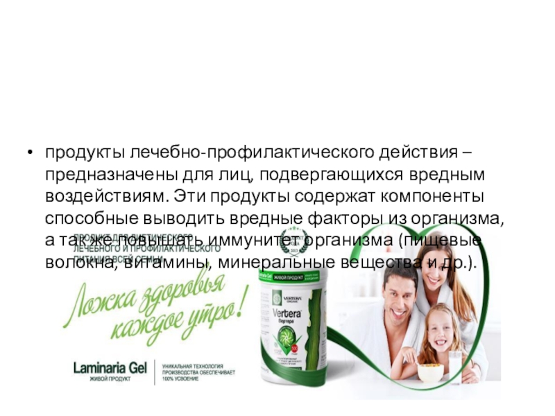 Слайд 7продукты лечебно-профилактического действия – предназначены для лиц, подвергающихся вредным воздействиям. Эти