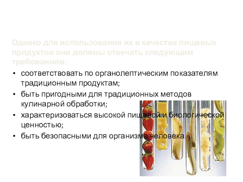 Слайд 17Однако для использования их в качестве пищевых продуктов они должны отвечать