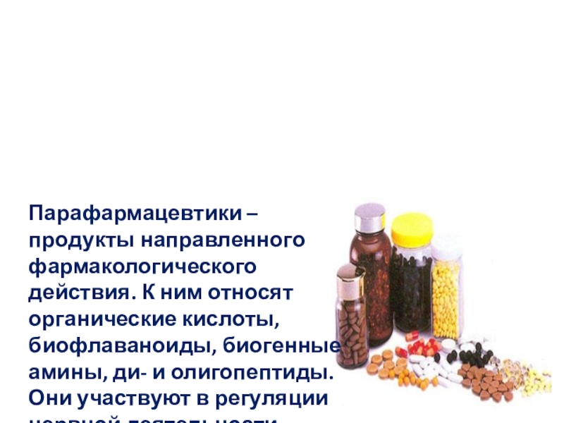 Слайд 11Парафармацевтики – продукты направленного фармакологического действия. К ним относят органические кислоты,