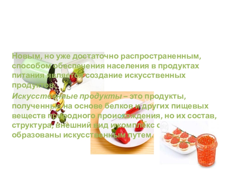 Искусственные продукты – это продукты, полученные на основе белков и других пищевых веществ природного происхождения, но их состав, структура, внешний вид и комплекс свойств образованы искусственным путем.