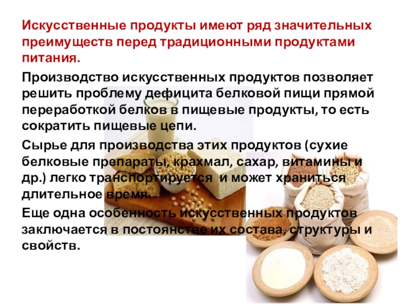 Слайд 18Искусственные продукты имеют ряд значительных преимуществ перед традиционными продуктами питания.