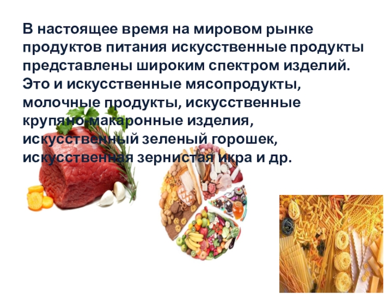 Слайд 19В настоящее время на мировом рынке продуктов питания искусственные продукты представлены