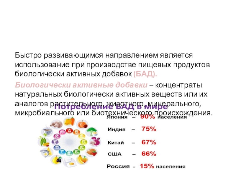 Слайд 8Быстро развивающимся направлением является использование при производстве пищевых продуктов биологически активных