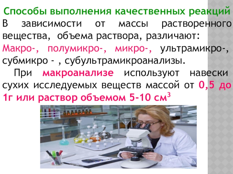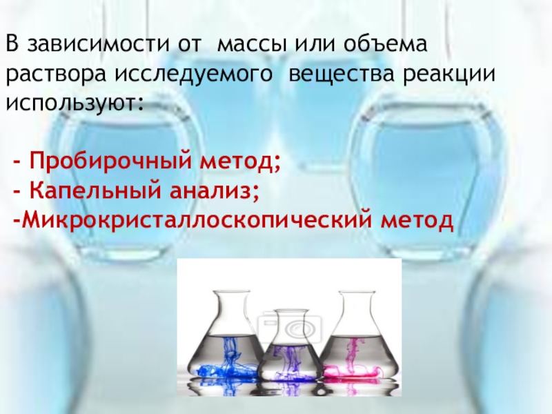 Слайд 8В зависимости от массы или объема раствора исследуемого вещества реакции используют: