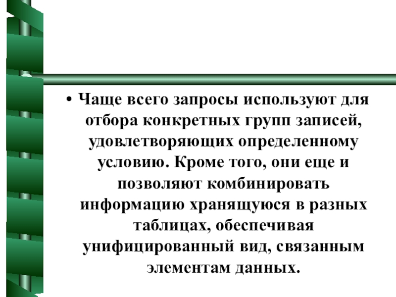 Чаще всего запросы используют для отбора конкретных групп записей, удовлетворяющих определенному
