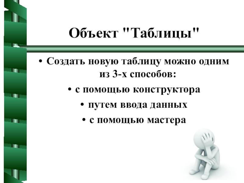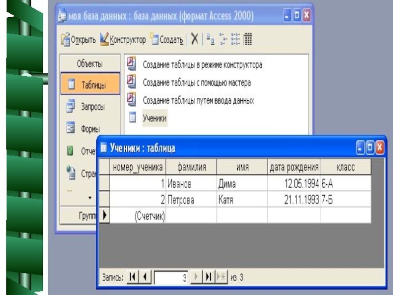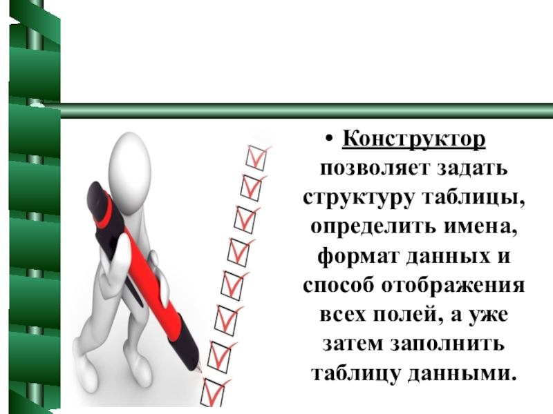 Слайд 8Конструктор позволяет задать структуру таблицы, определить имена, формат данных и способ