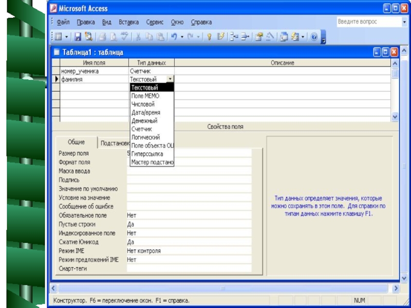нем. Тип данных выбирается из списка, который можно вызвать щелчком мыши в столбце Тип данных.