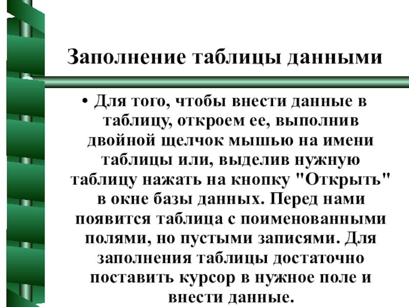 ее, выполнив двойной щелчок мышью на имени таблицы или, выделив нужную таблицу нажать на кнопку "Открыть" в окне базы данных. Перед нами появится таблица с поименованными полями, но пустыми записями. Для заполнения таблицы достаточно поставить курсор в нужное поле и внести данные.