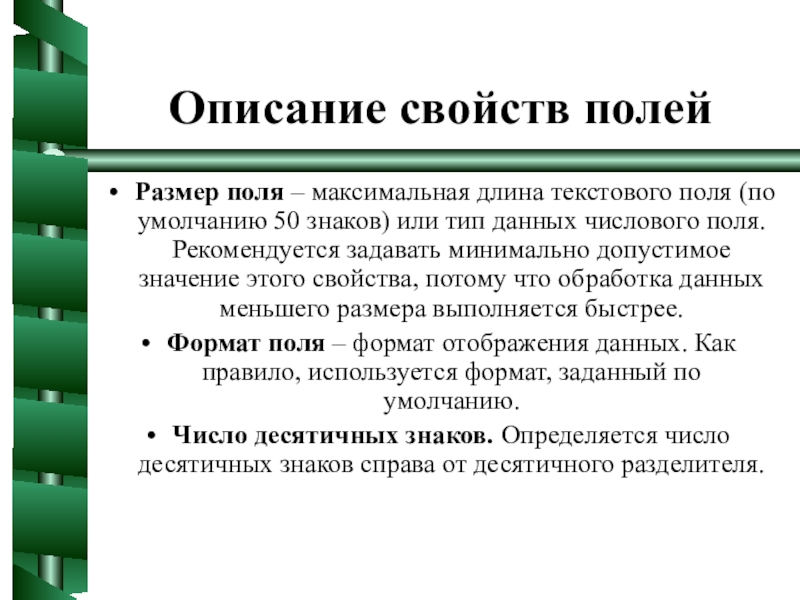 умолчанию 50 знаков) или тип данных числового поля. Рекомендуется задавать минимально допустимое значение этого свойства, потому что обработка данных меньшего размера выполняется быстрее.