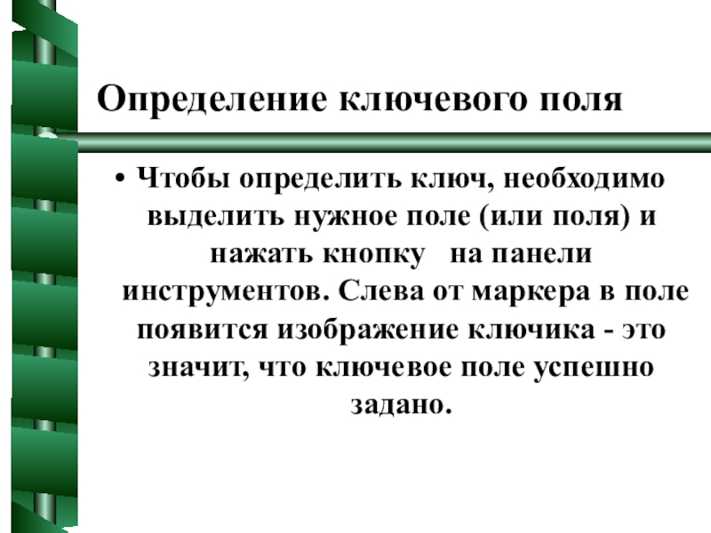 и нажать кнопку на панели инструментов. Слева от маркера в поле появится изображение ключика - это значит, что ключевое поле успешно задано.