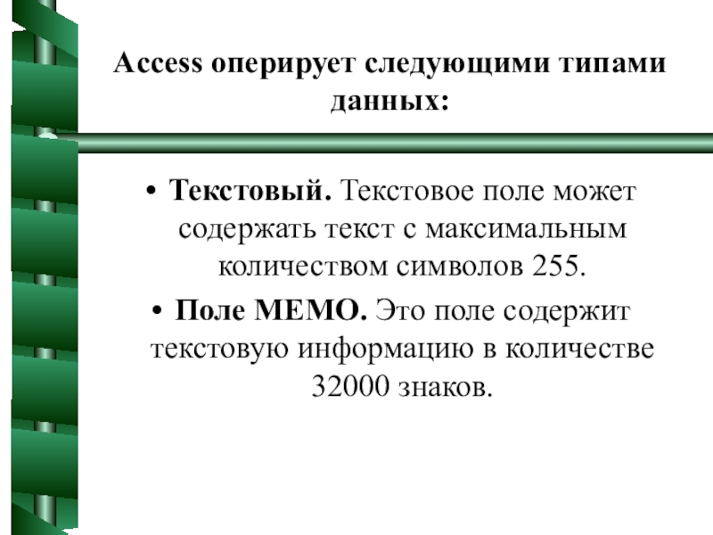 Поле MEMO. Это поле содержит текстовую информацию в количестве 32000 знаков.