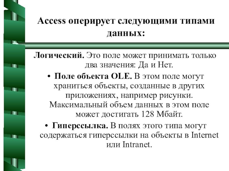Гиперссылка. В полях этого типа могут содержаться гиперссылки на объекты в Internet или Intranet.