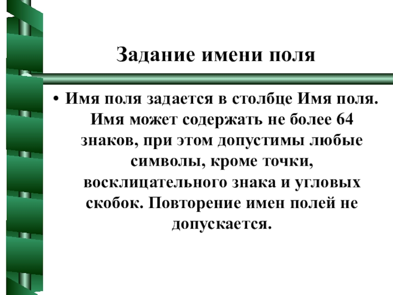 может содержать не более 64 знаков, при этом допустимы любые символы, кроме точки, восклицательного знака и угловых скобок. Повторение имен полей не допускается.