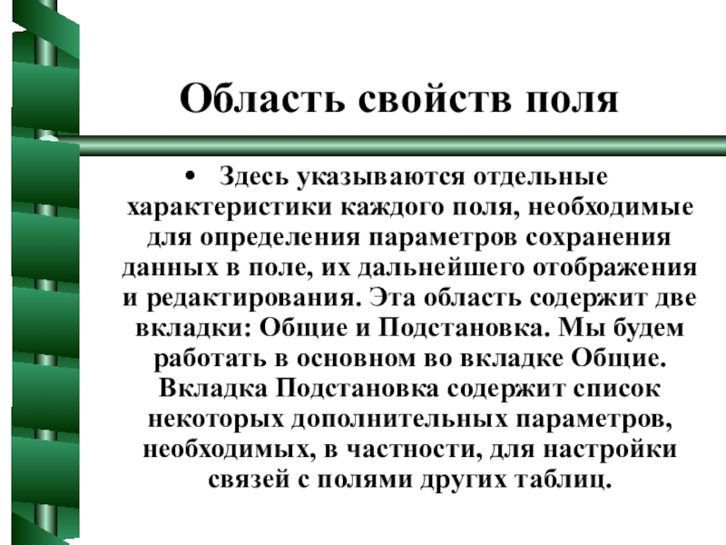 определения параметров сохранения данных в поле, их дальнейшего отображения и редактирования. Эта область содержит две вкладки: Общие и Подстановка. Мы будем работать в основном во вкладке Общие. Вкладка Подстановка содержит список некоторых дополнительных параметров, необходимых, в частности, для настройки связей с полями других таблиц.