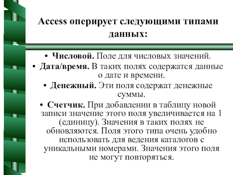 Счетчик. При добавлении в таблицу новой записи значение этого поля увеличивается на 1 (единицу). Значения в таких полях не обновляются. Поля этого типа очень удобно использовать для ведения каталогов с уникальными номерами. Значения этого поля не могут повторяться.