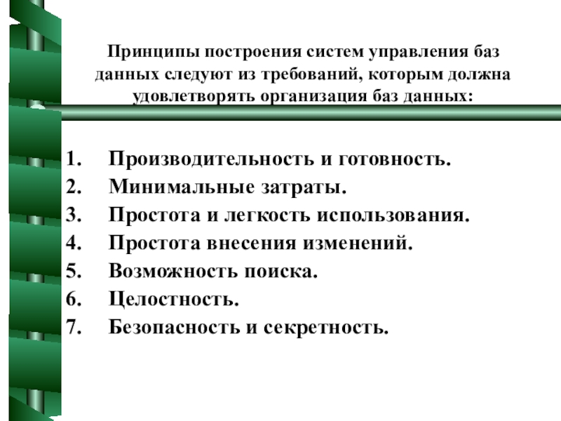 Слайд 31Принципы построения систем управления баз данных следуют из требований, которым должна