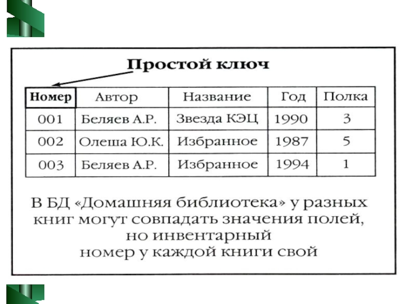 крайней мере одно ключевое поле. Как правило, в качестве ключевых полей указываются поля типа "Счетчик". В любом случае, поле ключа не должно содержать повторяющихся данных. Используя ключевое поле можно исключить конфликты повторяющихся записей в базе данных.