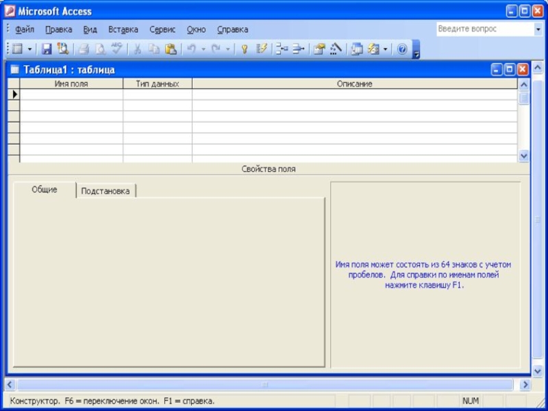 с заголовком "Таблица1" (имя таблицы по умолчанию). Условно это окно можно поделить на две области: Область полей таблицы и Область свойств поля.