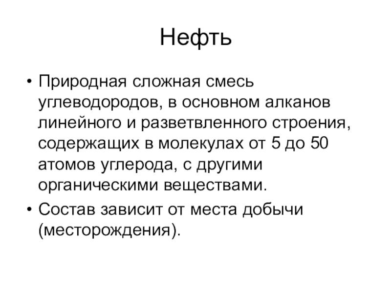 НефтьПриродная сложная смесь углеводородов, в основном алканов линейного и разветвленного строения, содержащих в молекулах от 5 до 50 атомов углерода, с другими органическими веществами.Состав зависит от места добычи (месторождения).