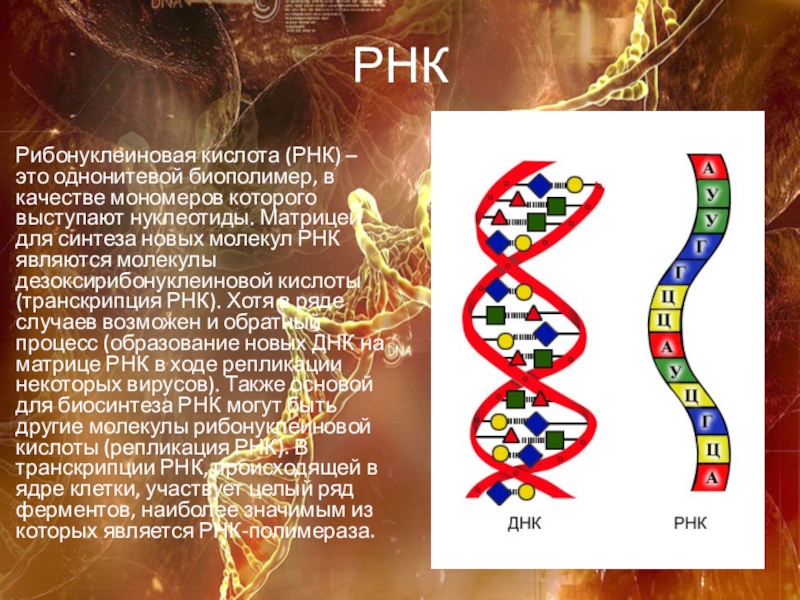 РНКРибонуклеиновая кислота (РНК) – это однонитевой биополимер, в качестве мономеров которого выступают нуклеотиды. Матрицей для синтеза новых