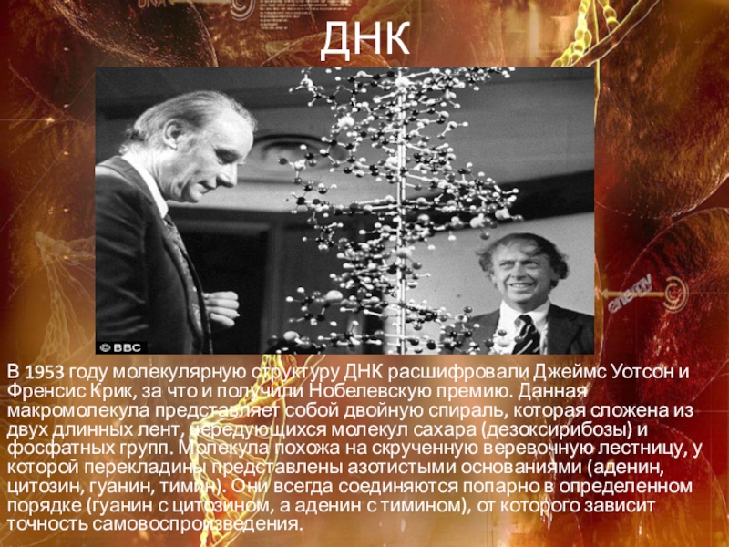 ДНКВ 1953 году молекулярную структуру ДНК расшифровали Джеймс Уотсон и Френсис Крик, за что и получили Нобелевскую