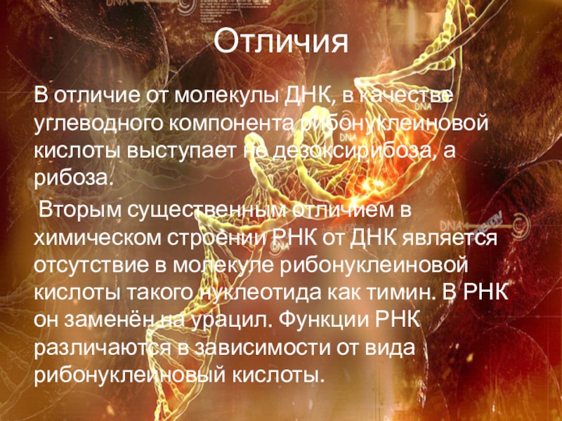 ОтличияВ отличие от молекулы ДНК, в качестве углеводного компонента рибонуклеиновой кислоты выступает не дезоксирибоза, а рибоза. Вторым