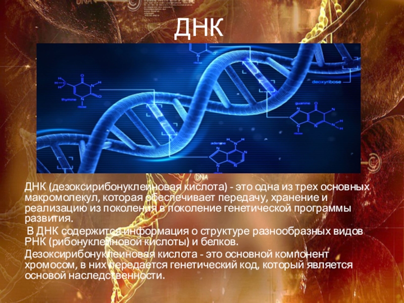 ДНКДНК (дезоксирибонуклеиновая кислота) - это одна из трех основных макромолекул, которая обеспечивает передачу, хранение и реализацию из