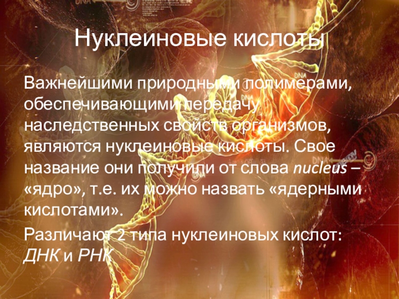 Нуклеиновые кислотыВажнейшими природными полимерами, обеспечивающими передачу наследственных свойств организмов, являются нуклеиновые кислоты. Свое название они получили от слова nucleus – «ядро», т.е. их можно назвать «ядерными кислотами».Различают 2 типа нуклеиновых кислот: ДНК и РНК