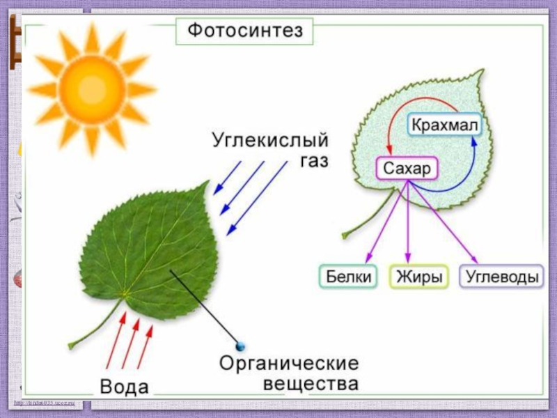 6CO2 + 6H2O hν, хлорофилл → C6H12O6 + 6O2