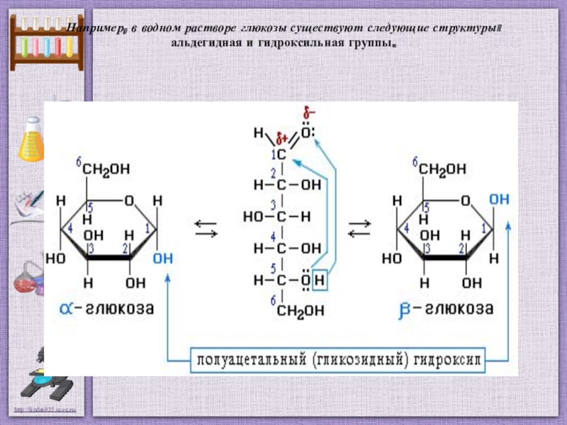 Слайд 15Например, в водном растворе глюкозы существуют следующие структуры: