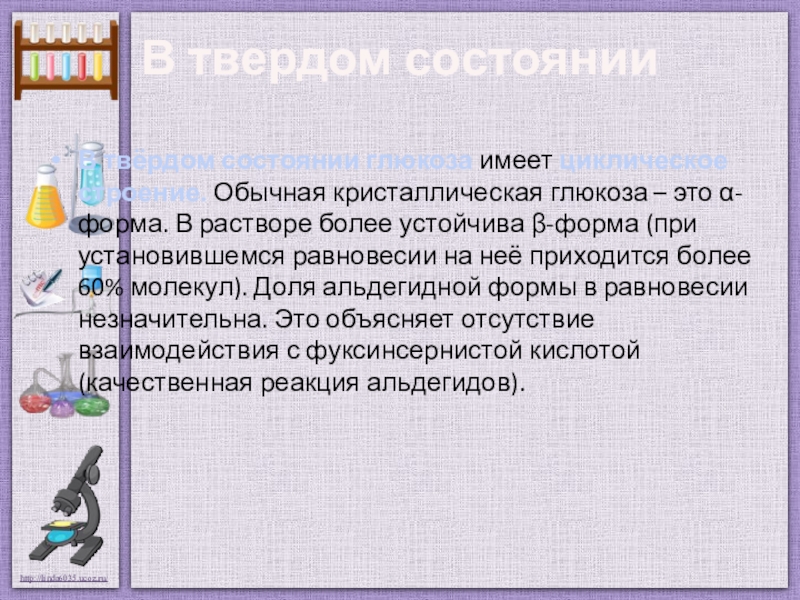 В твёрдом состоянии глюкоза имеет циклическое строение. Обычная кристаллическая