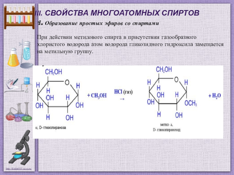 присутствии газообразного хлористого водорода атом водорода гликозидного гидроксила замещается на метильную группу.