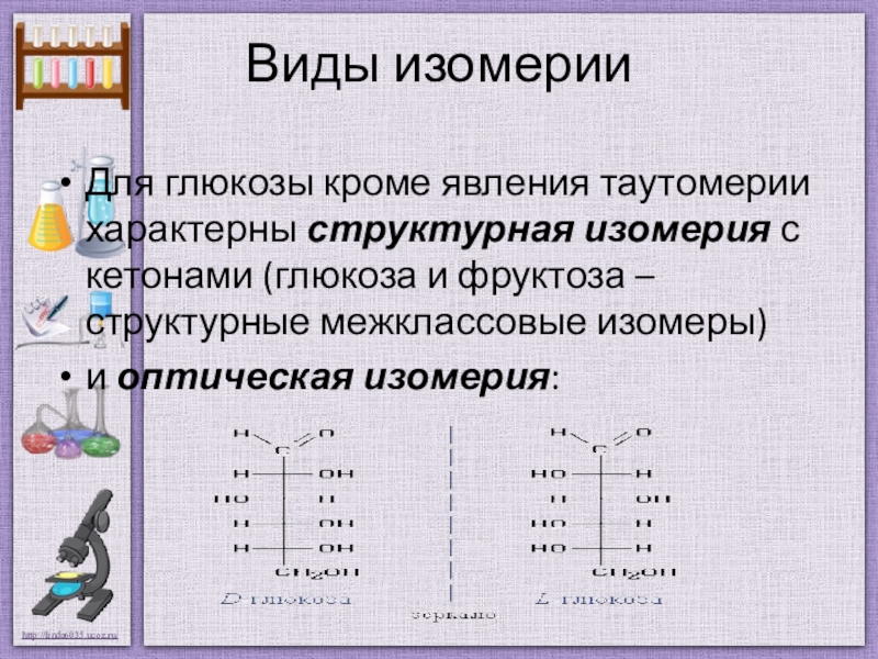 Для глюкозы кроме явления таутомерии характерны структурная изомерия с кетонами (глюкоза и