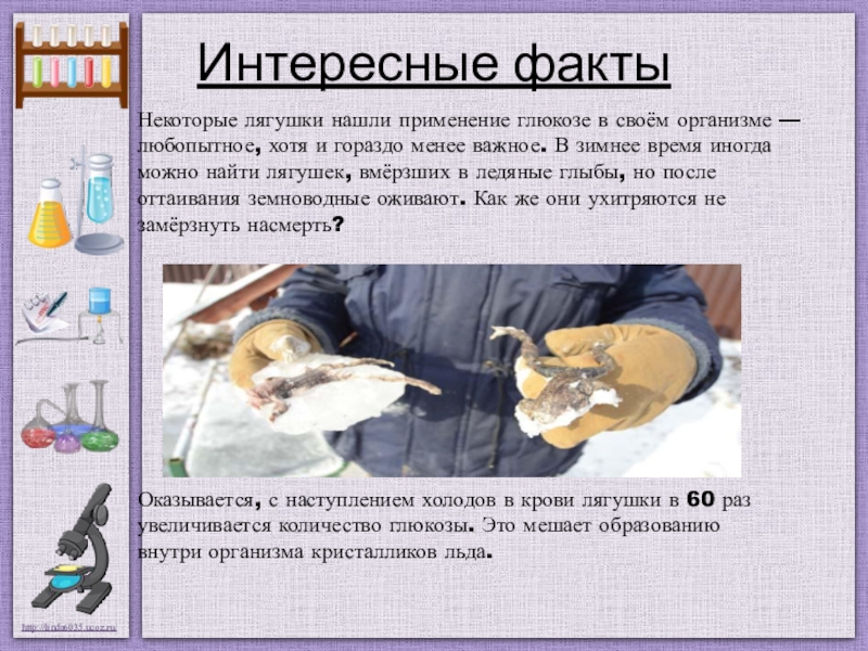 Оказывается, с наступлением холодов в крови лягушки в 60 раз увеличивается количество глюкозы. Это мешает образованию внутри организма кристалликов льда.