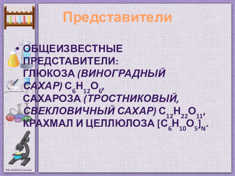 Общеизвестные представители: глюкоза (виноградный сахар) С6Н12О6, сахароза (тростниковый, свекловичный сахар) С12Н22О11, крахмал и целлюлоза [С6Н10О5]n.