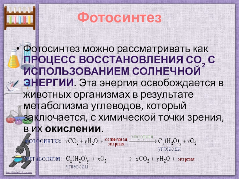 Фотосинтез можно рассматривать как процесс восстановления СО2 с использованием солнечной энергии. Эта энергия освобождается