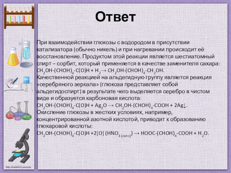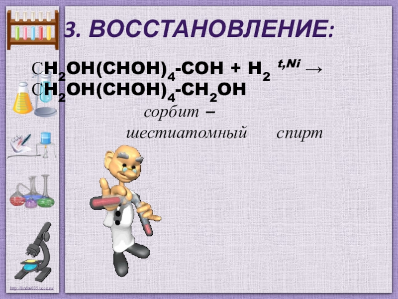 при нагревании происходит её восстановление. Продуктом этой реакции является шестиатомный спирт – сорбит, который применяется в качестве заменителя сахара: