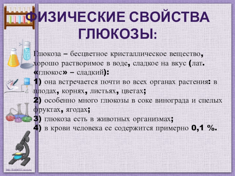Глюкоза – бесцветное кристаллическое вещество, хорошо растворимое в воде,