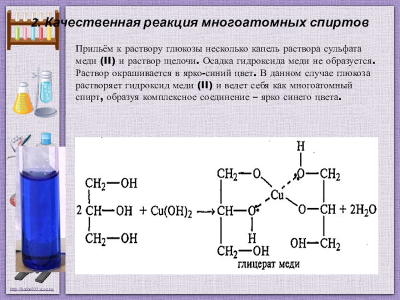 сульфата меди (II) и раствор щелочи. Осадка гидроксида меди не образуется. Раствор окрашивается в ярко-синий цвет. В данном случае глюкоза растворяет гидроксид меди (II) и ведет себя как многоатомный спирт, образуя комплексное соединение – ярко синего цвета.