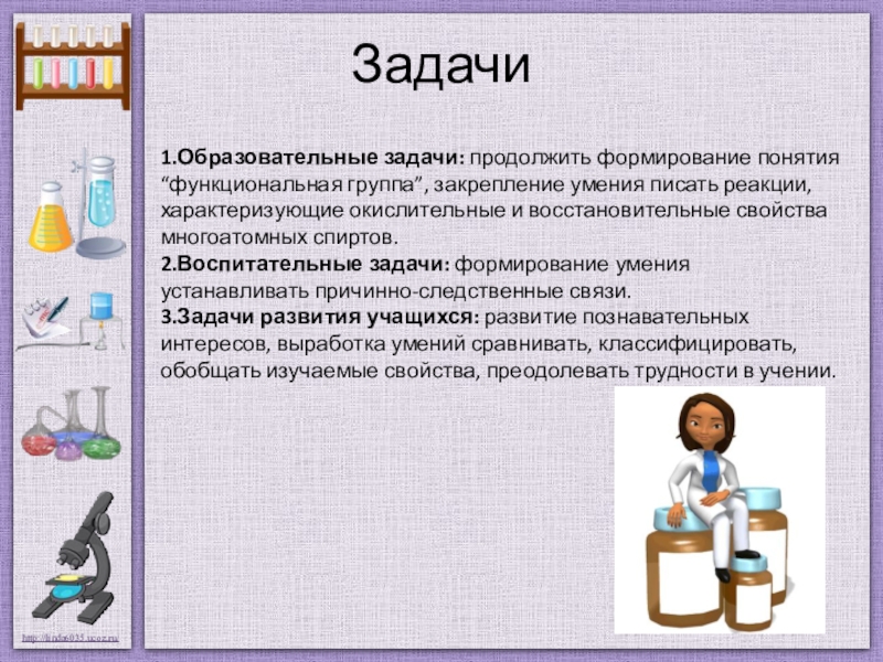 1.Образовательные задачи: продолжить формирование понятия “функциональная группа”, закрепление умения писать реакции, характеризующие