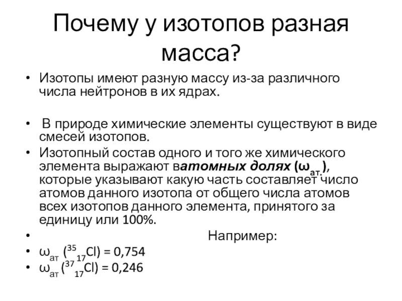 Изотопный состав одного и того же химического элемента выражают ватомных долях (ωат.), которые указывают какую часть составляет число атомов данного изотопа от общего числа атомов всех изотопов данного элемента, принятого за единицу или 100%.