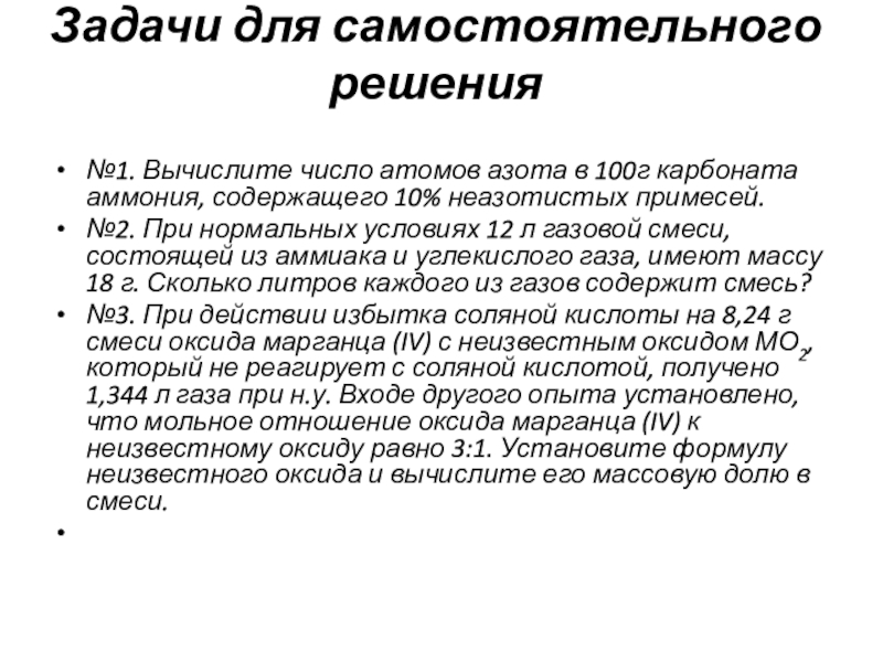 №3. При действии избытка соляной кислоты на 8,24 г смеси оксида марганца (IV) с неизвестным оксидом МО2, который не реагирует с соляной кислотой, получено 1,344 л газа при н.у. Входе другого опыта установлено, что мольное отношение оксида марганца (IV) к неизвестному оксиду равно 3:1. Установите формулу неизвестного оксида и вычислите его массовую долю в смеси.