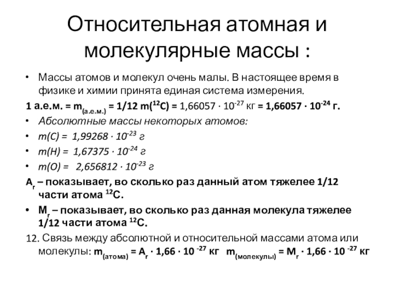 12. Связь между абсолютной и относительной массами атома или молекулы: m(атома) = Ar ∙ 1,66 ∙ 10 -27 кг m(молекулы) = Mr ∙ 1,66 ∙ 10 -27 кг