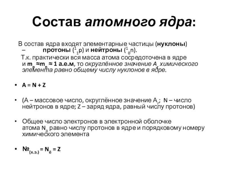 (А – массовое число, округлённое значение Аr; N – число нейтронов в ядре; Z – заряд ядра, равный числу протонов)
