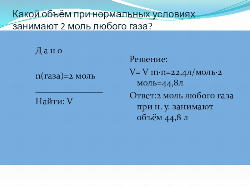Ответ:2 моль любого газа при н. у. занимают объём 44,8 л
